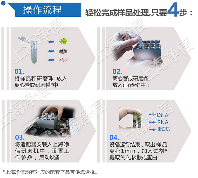 上海凈信?的Tissuelyser?組織研磨儀是一種特殊的、快速的、高效率的、多試管的一致系統。它能將任何來源(包括土壤、植物和動物的組織/器官、細菌、酵母、真菌、孢子、古生物標本等)的原始DNA、RNA和蛋白質進行提取和純化。